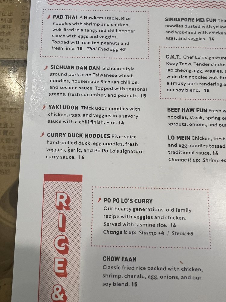 Five-spice hand-pulled duck, egg noodles, fresh veggies, garlic, and Po Po Lo's signature curry sauce.